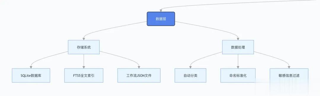 后端采用 FastAPI 框架,提供 RESTful API 并自动生成 OpenAPI 文档,处理工作流的检索、分析请求数据库SQLite 搭配 FTS5 扩展,实现高效的全文检索功能,这也是搜索能做到亚 100ms 的关键前端采用现代 HTML5+CSS/JavaScript 实现响应式设计,确保在移动设备上也有良好体验分析工具自定义 Python 脚本负责工作流的自动分类、命名规范化和元数据提取优化策略使用 Gzip 压缩、MD5 哈希变更检测、后台处理等技术确保系统性能特别值得一提的是它的变更检测机制 —— 通过 MD5 哈希实现高效重索引,避免了不必要的全量处理,大大提升了系统效率。