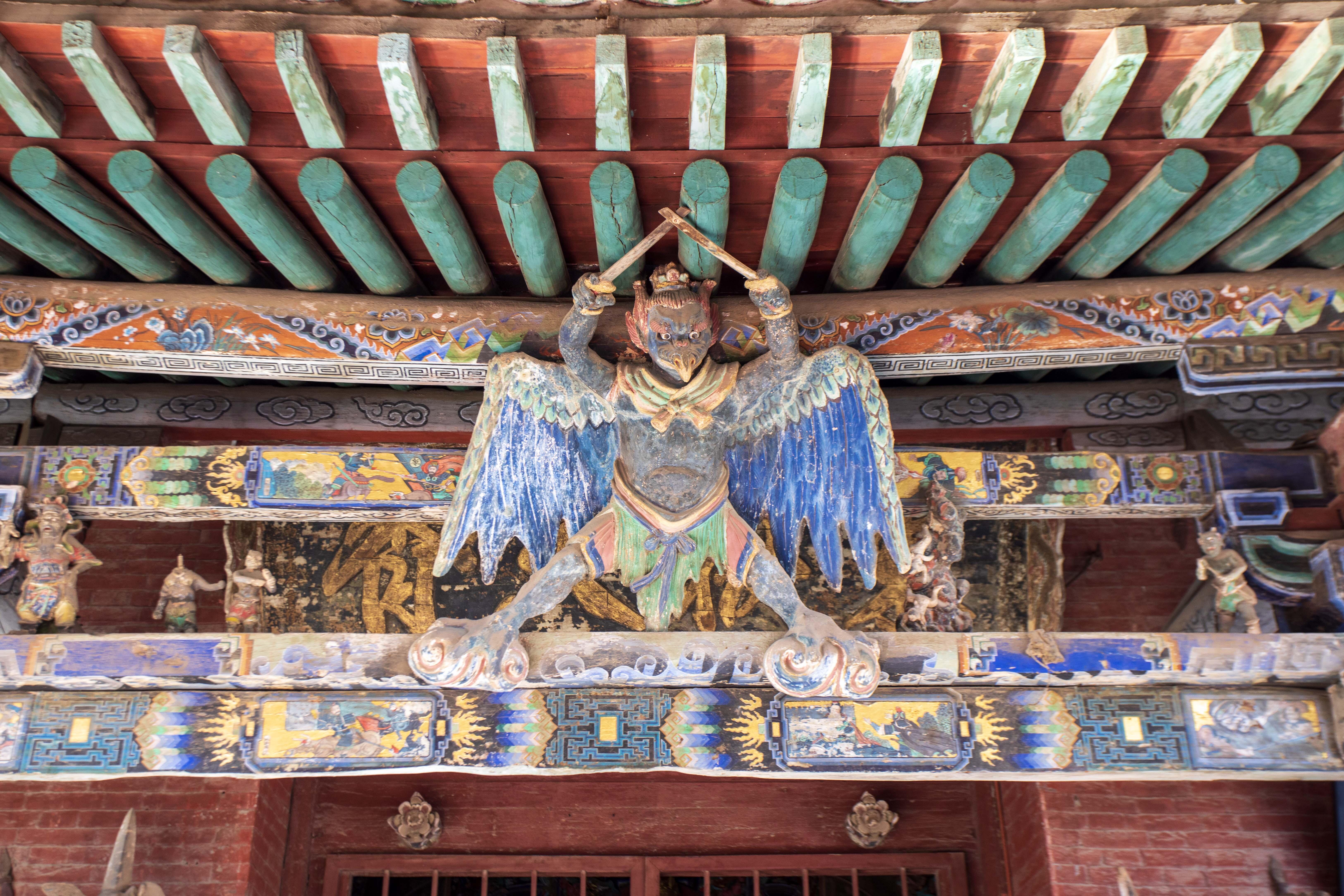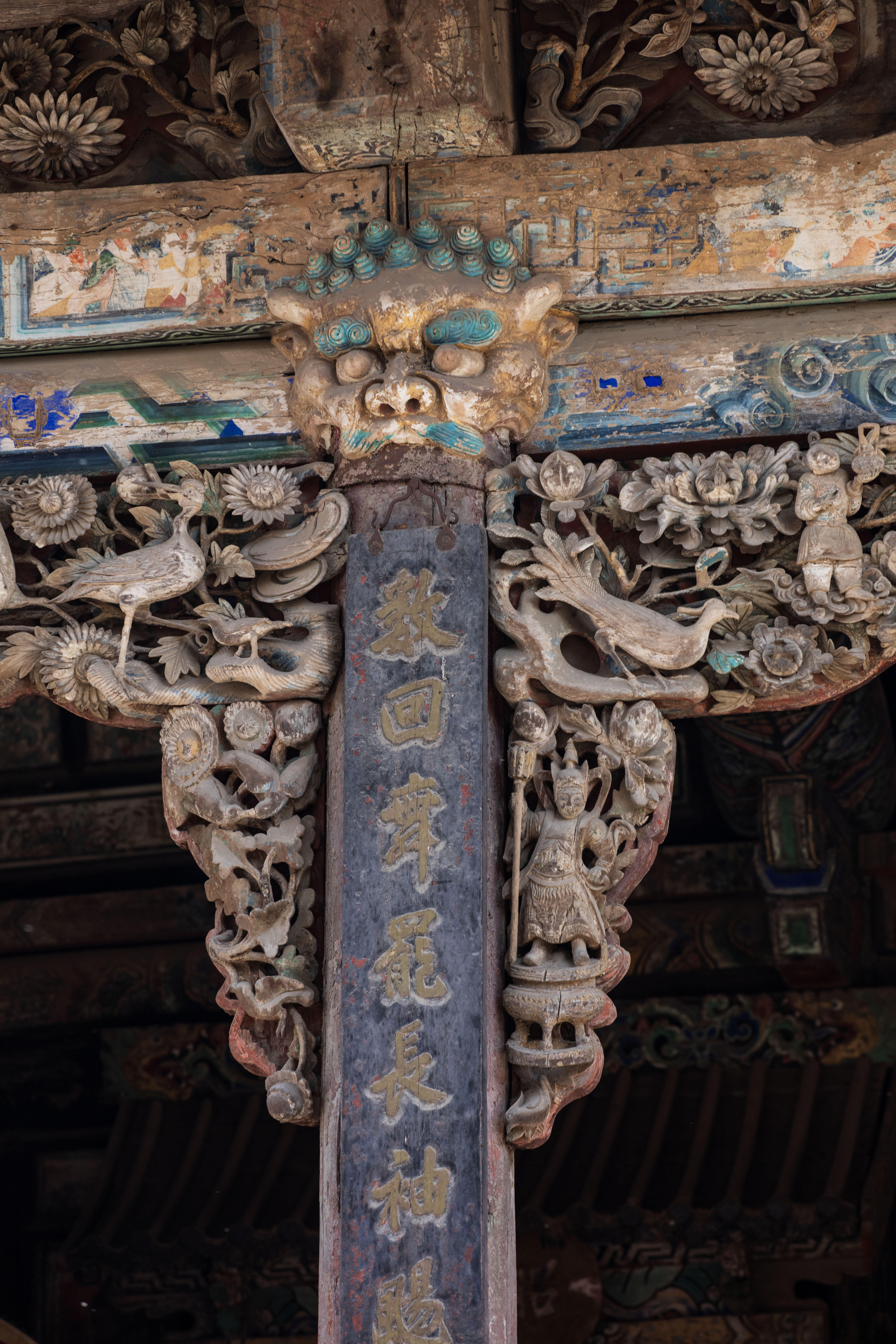 穿过献亭,行宫大殿便出现在眼前。这座元代建筑采用重檐歇山顶的形式,远远望去,气势恢宏。最引人注目的,是正脊上那10尊琉璃马武士。在众多古建筑中,这样的正脊装饰十分罕见。琉璃的光泽在阳光下闪烁,马武士身姿挺拔,仿佛随时准备驰骋沙场。大殿一层的围廊环绕着18根石质枺棱檐柱,前檐柱头还雕刻着兽面。在晋南地区,这样的石柱并不多见,每一根都像是守护庙宇的卫士,历经风雨依然屹立不倒。