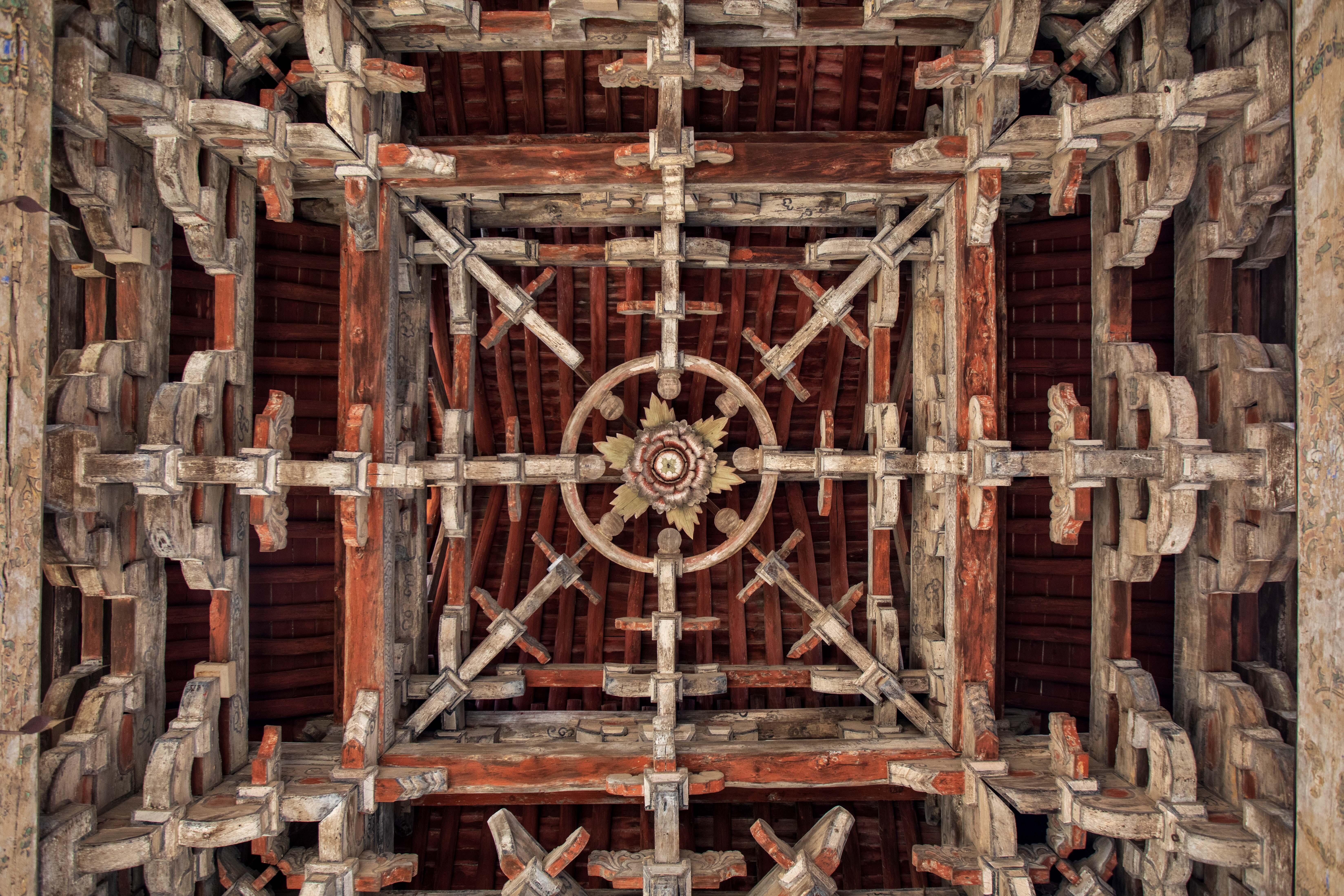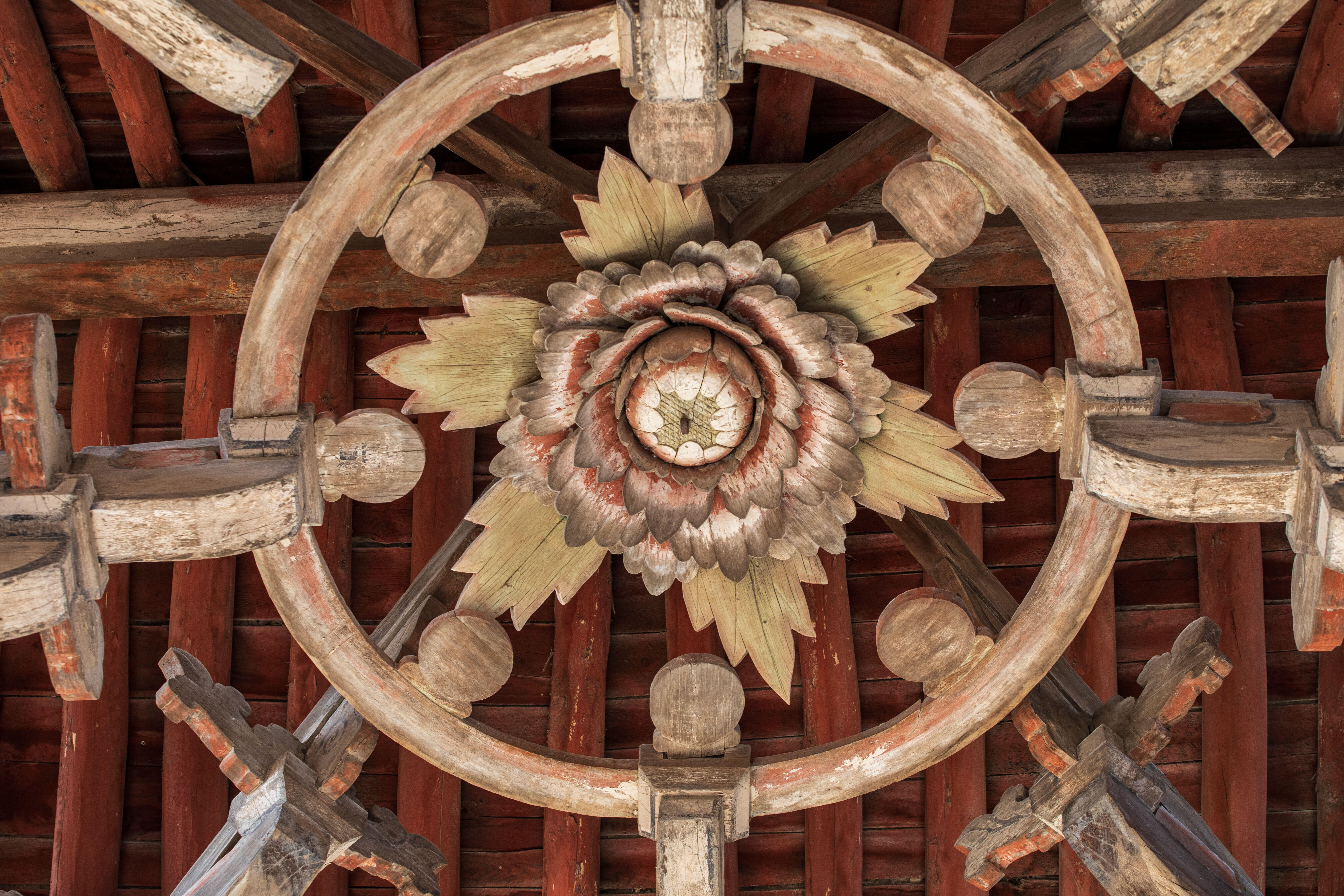 走进看亭,仰头望向藻井,中间以牡丹花为造型的设计令人赞叹。花瓣层层叠叠,花蕊精致细腻,仿佛下一秒就能闻到花香。而献亭的石柱和柱础,则堪称金代遗存的精品。石柱表面光滑,纹理清晰,柱础上的雕刻更是一绝。西南角的柱础上,浪花翻涌,鱼、龟、马等动物穿梭其中,生动地展现了水中世界的热闹景象。这些雕刻出自金泰和六年蒲县石匠李霖之手,近八百年过去,依然线条流畅,细节丰富,让人不得不为古代工匠的高超技艺所折服。