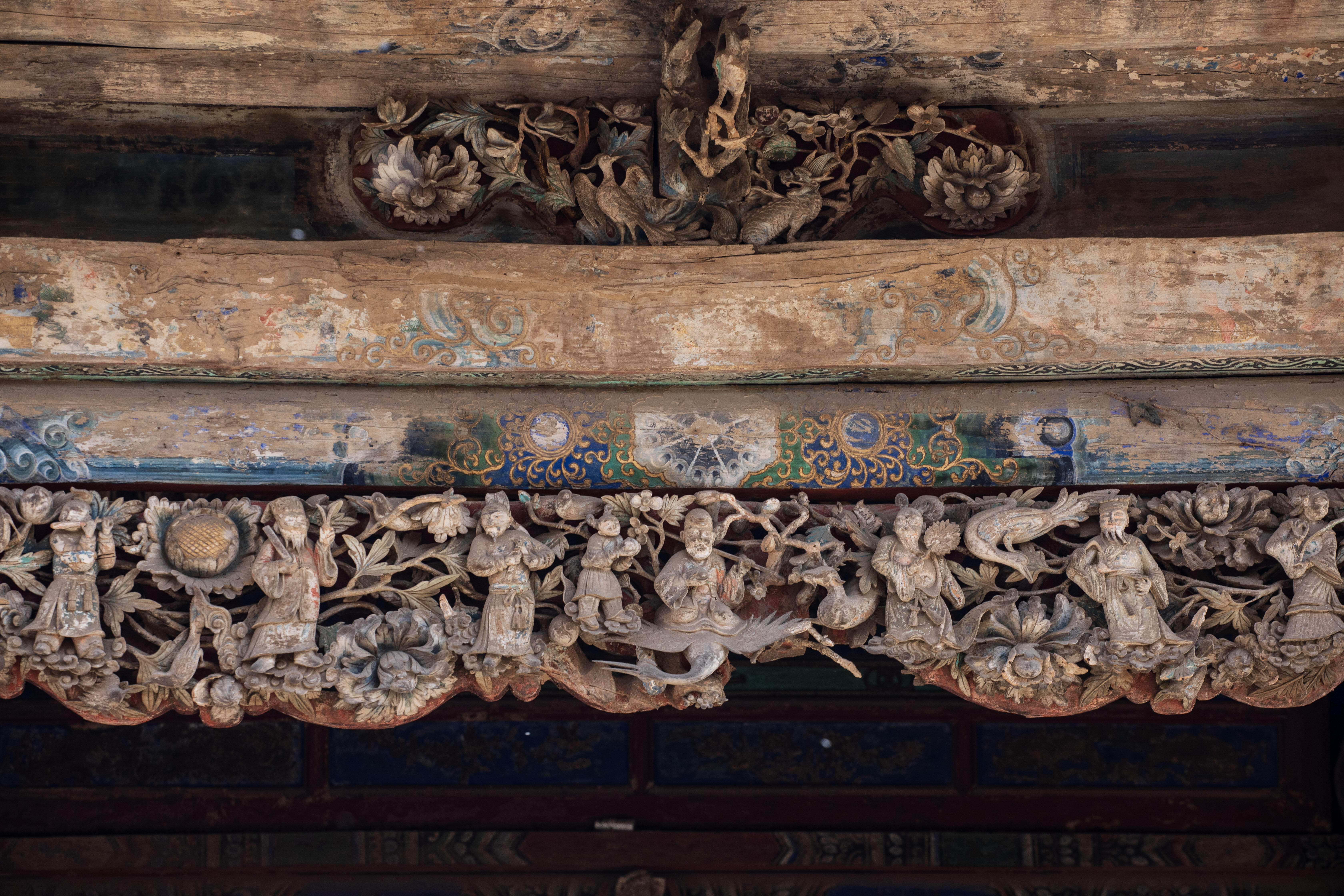 跨过山门,迎面便是天堂楼。脚步不自觉地慢下来,生怕惊扰了这份静谧。继续前行,凌霄殿、天王殿等建筑依次呈现,每一座殿宇都带着古朴的气质。最吸引人驻足的,是那座乐楼。绕到乐楼背面,檐下的木雕雀替让人眼前一亮。中间雕刻的是道家八仙祝寿图,八仙神态各异,手中的法器栩栩如生;西面是渔樵图,渔夫撑篙、樵夫担柴,一派悠然的山野生活场景;东面则是耕读图,农夫耕作、书生苦读,刻画得细致入微。这些木雕不仅展现了精湛的技艺,更将传统的生活图景与道家文化巧妙融合。