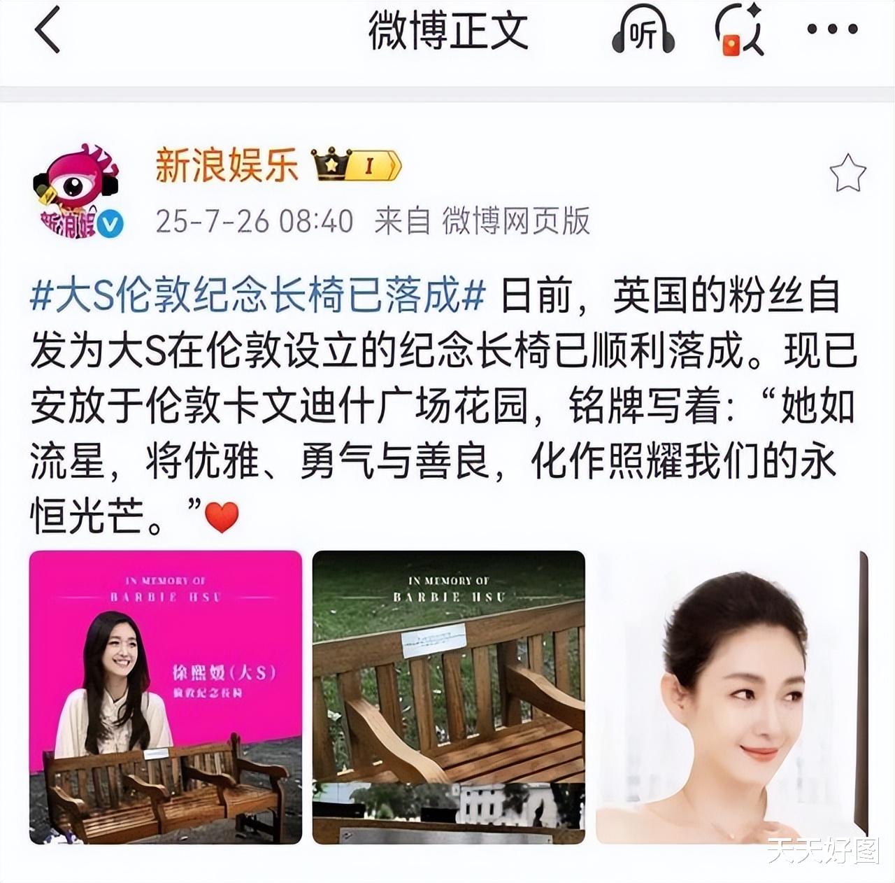 由于事发突然,按照家属的意愿,大S逝后隔天就被火化,追思会仅限生前挚友,在家举行简短酒会,而她的墓地也没有对外开放,所以有网友在伦敦为大 S 筹建了一座纪念长椅 。