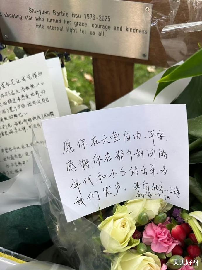 在长椅中间摆着大 S 的照片,照片旁堆满了鲜花和写给她的信 。信中,粉丝们倾诉着对她的思念,“流星虽逝,光芒永存。大S的精神,就像那长椅上的鲜花,永不凋谢”。