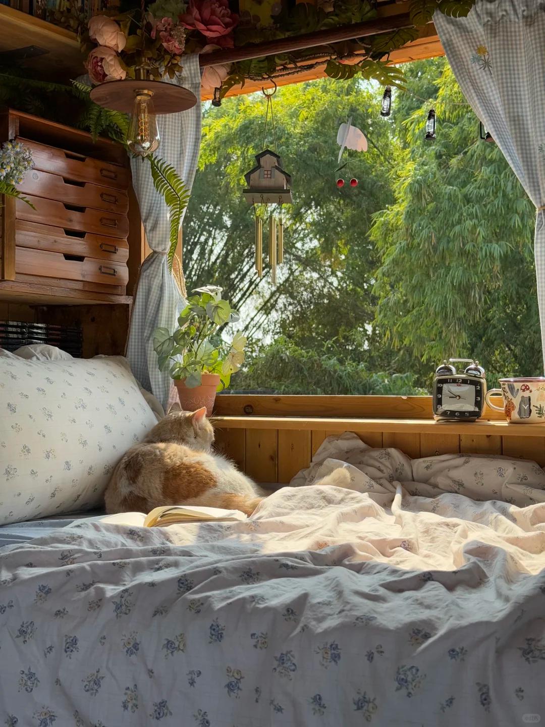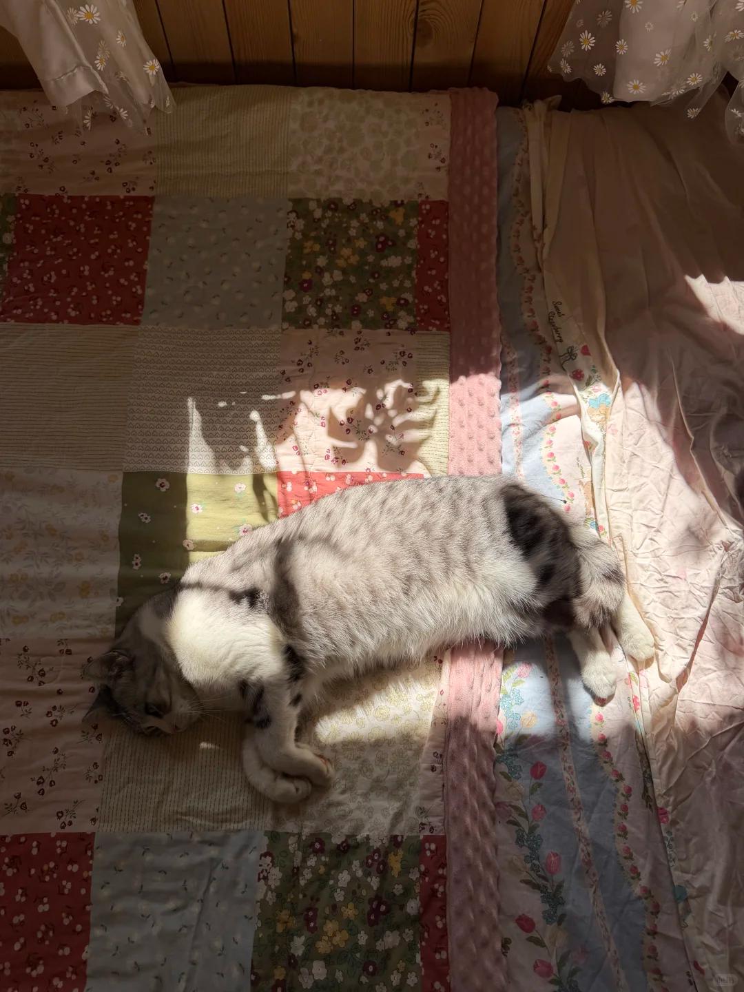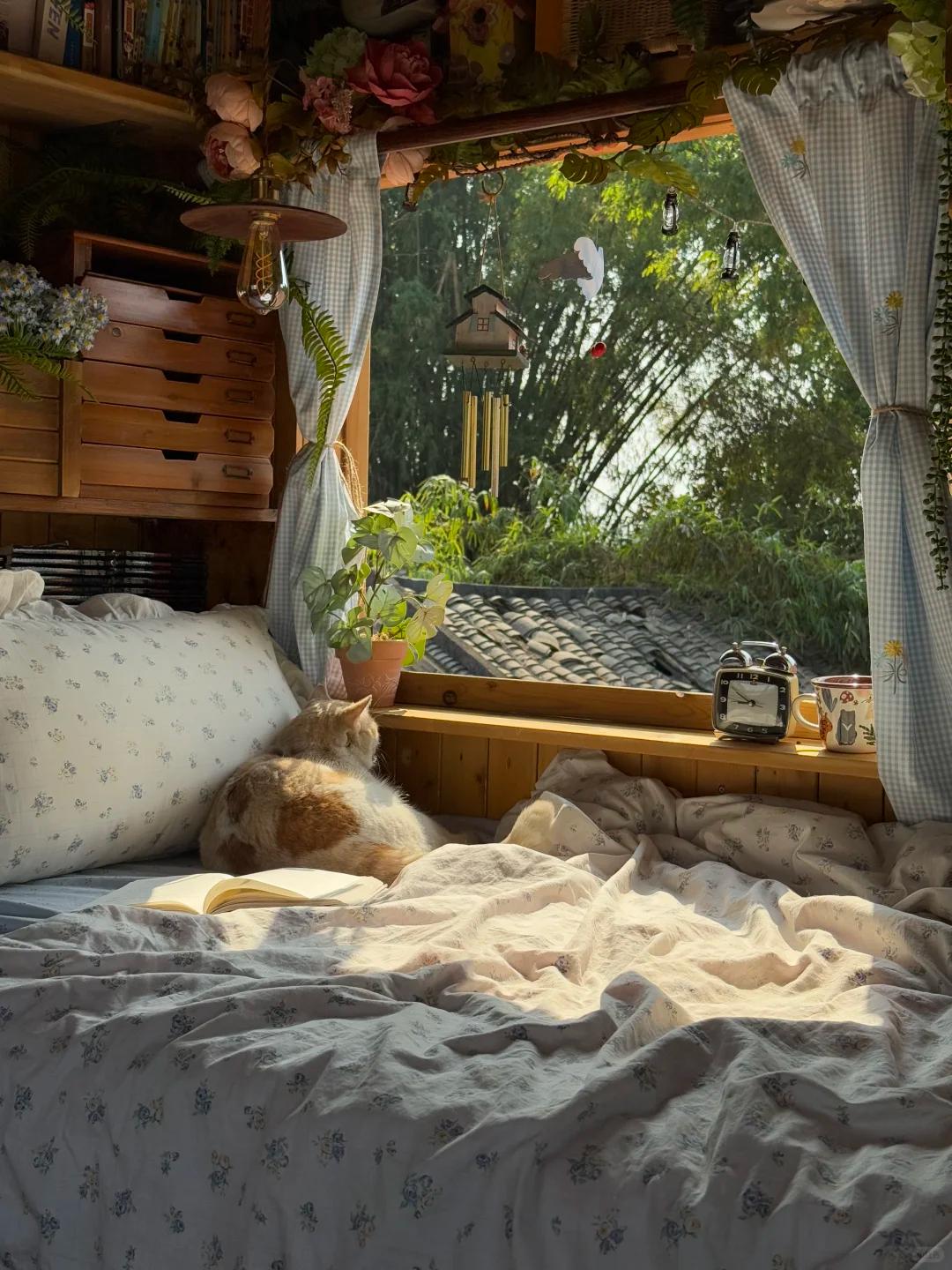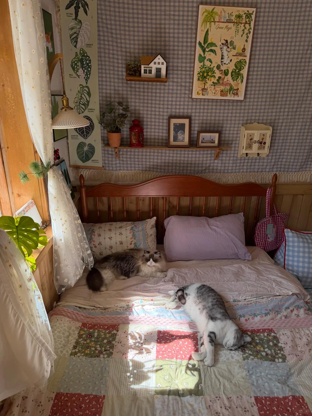 侧面就是窗户,每天早上,她其次之后,家里的小猫就喜欢调到床上,趴在上面晒太阳,惬意舒服;
