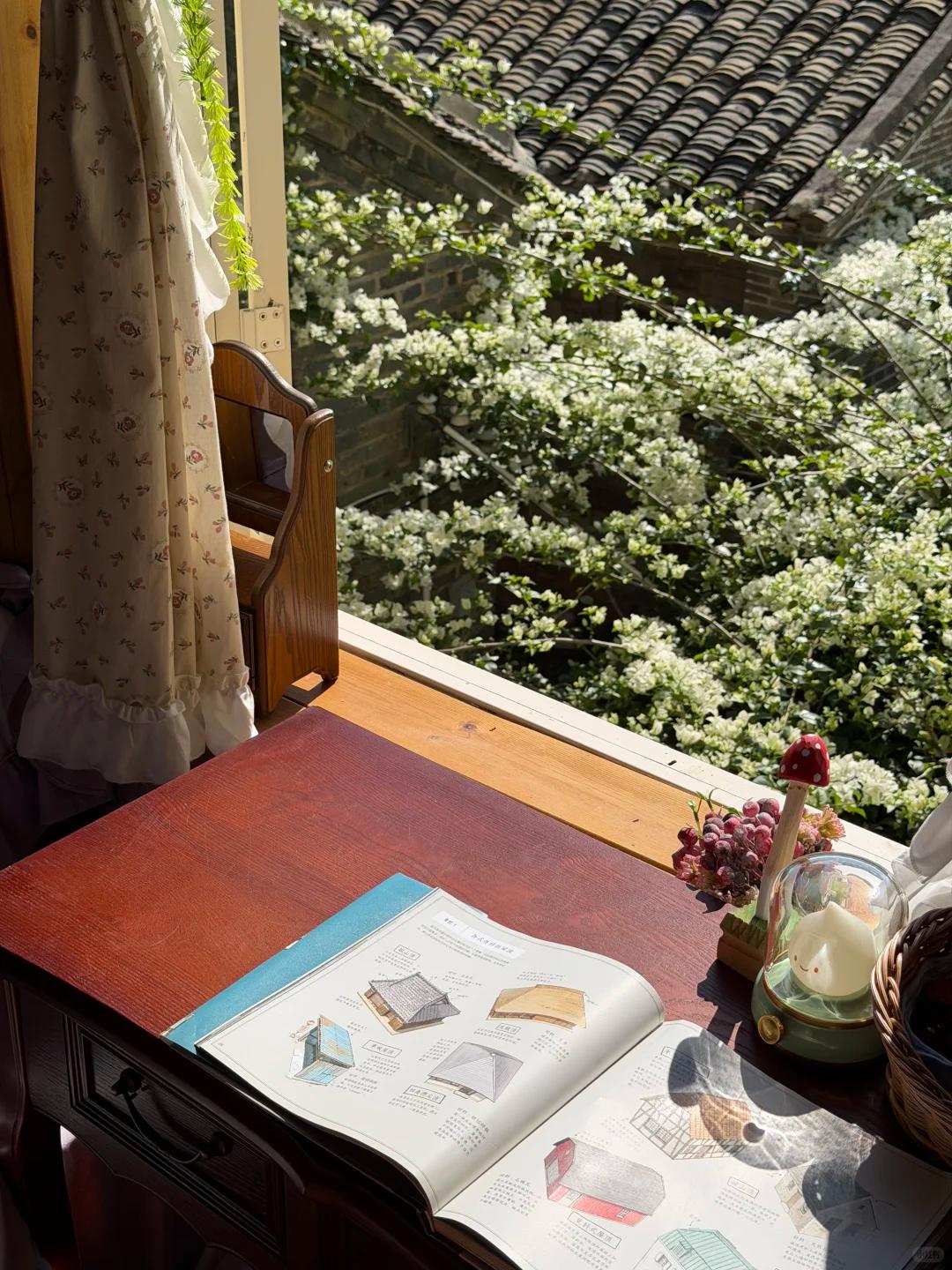 单看这个窗景,也是绝美的,木质窗框搭配带有花纹的白色窗帘,窗帘还用绿色的绑带系着,一抬头,就可以看到灰瓦屋顶、绿水青山,微风吹来,疲惫感瞬间消失;