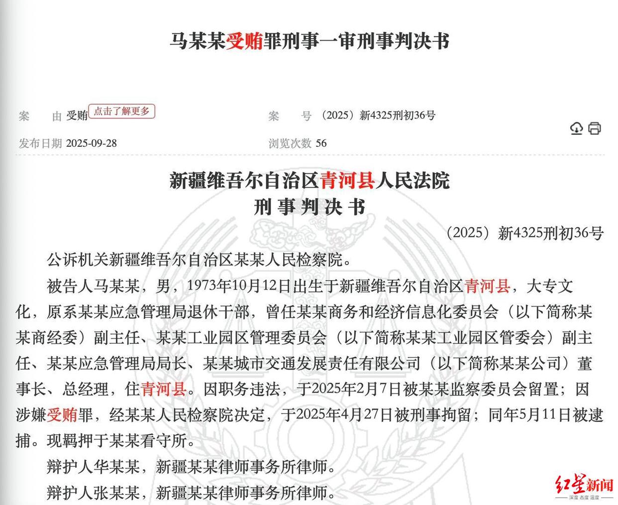 近日,中国裁判文书网公开的一审判决书显示,新疆维吾尔自治区青河县原应急管理局局长马某某因犯受贿罪,被青河县人民法院一审判