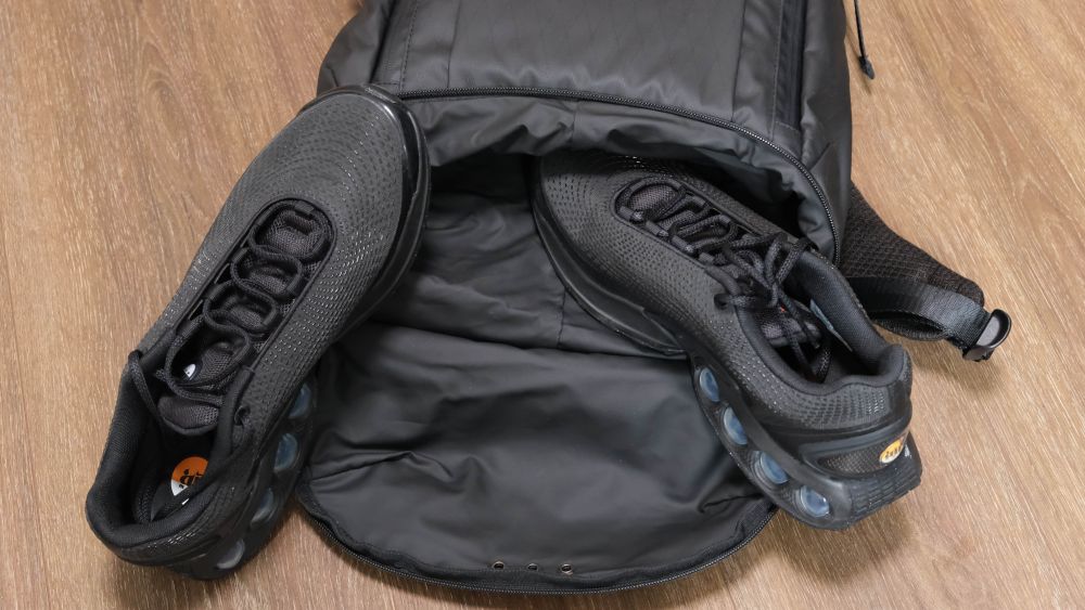 地平线8号轻旅行双肩包底部设计有独立防泼水收纳仓,与主仓完全干湿分离,可存放一双44码的球鞋或湿衣物,平时在酒店洗的衣服鞋子啥的平时都很难带走,有了这个鞋仓这就不是问题了。而且有时候自己也会在去健身的时候使用这款背包收纳健身装备。