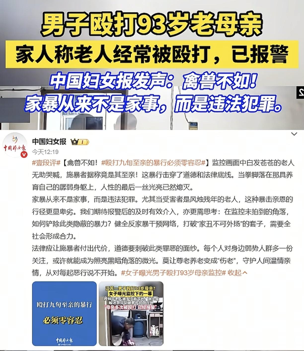 但看到“儿子暴打93岁母亲”这起报道后,莫名其妙的感觉心堵得发慌,这是有多丧心病狂,才会对年事已高的老母亲大打出手。