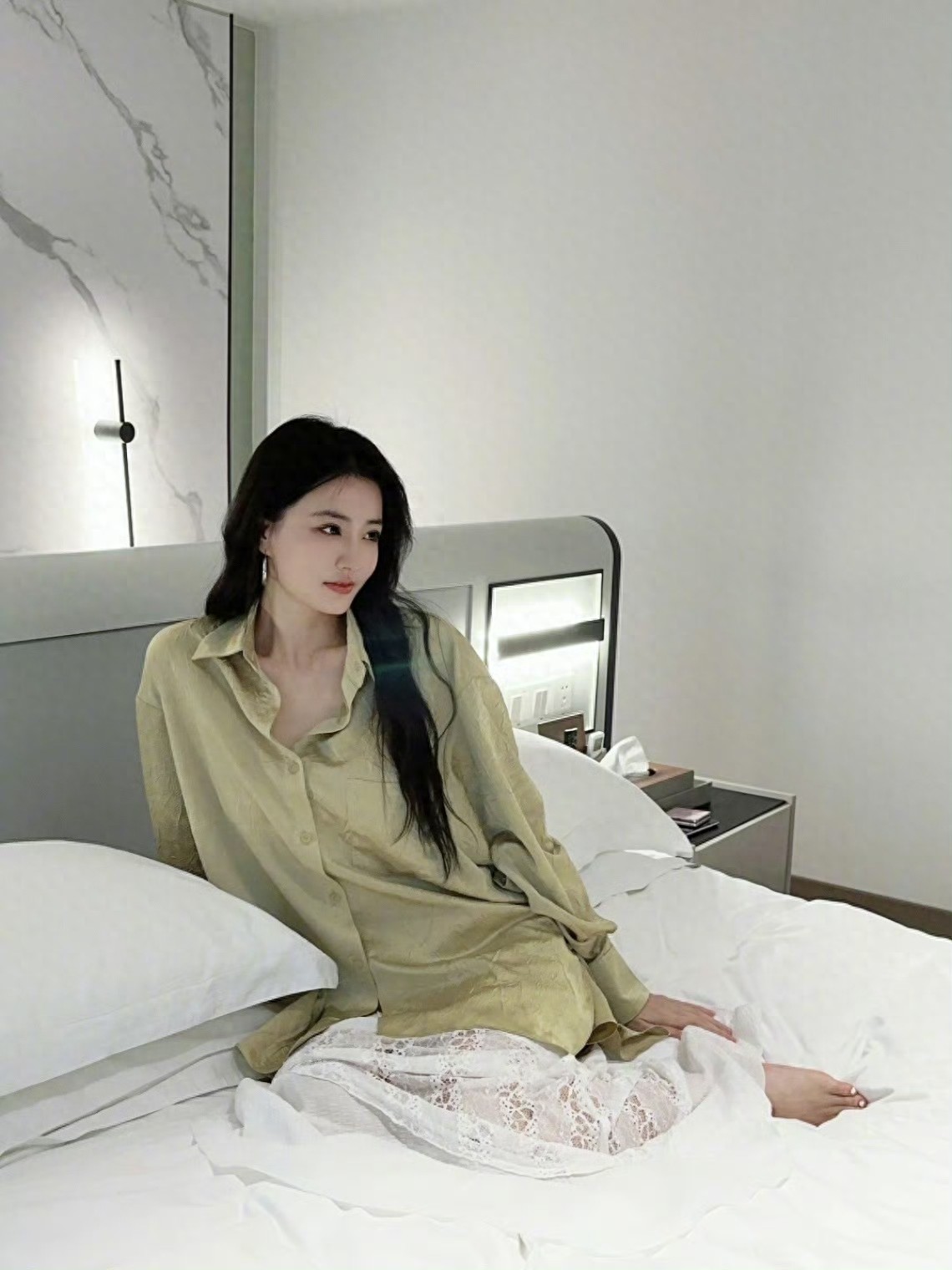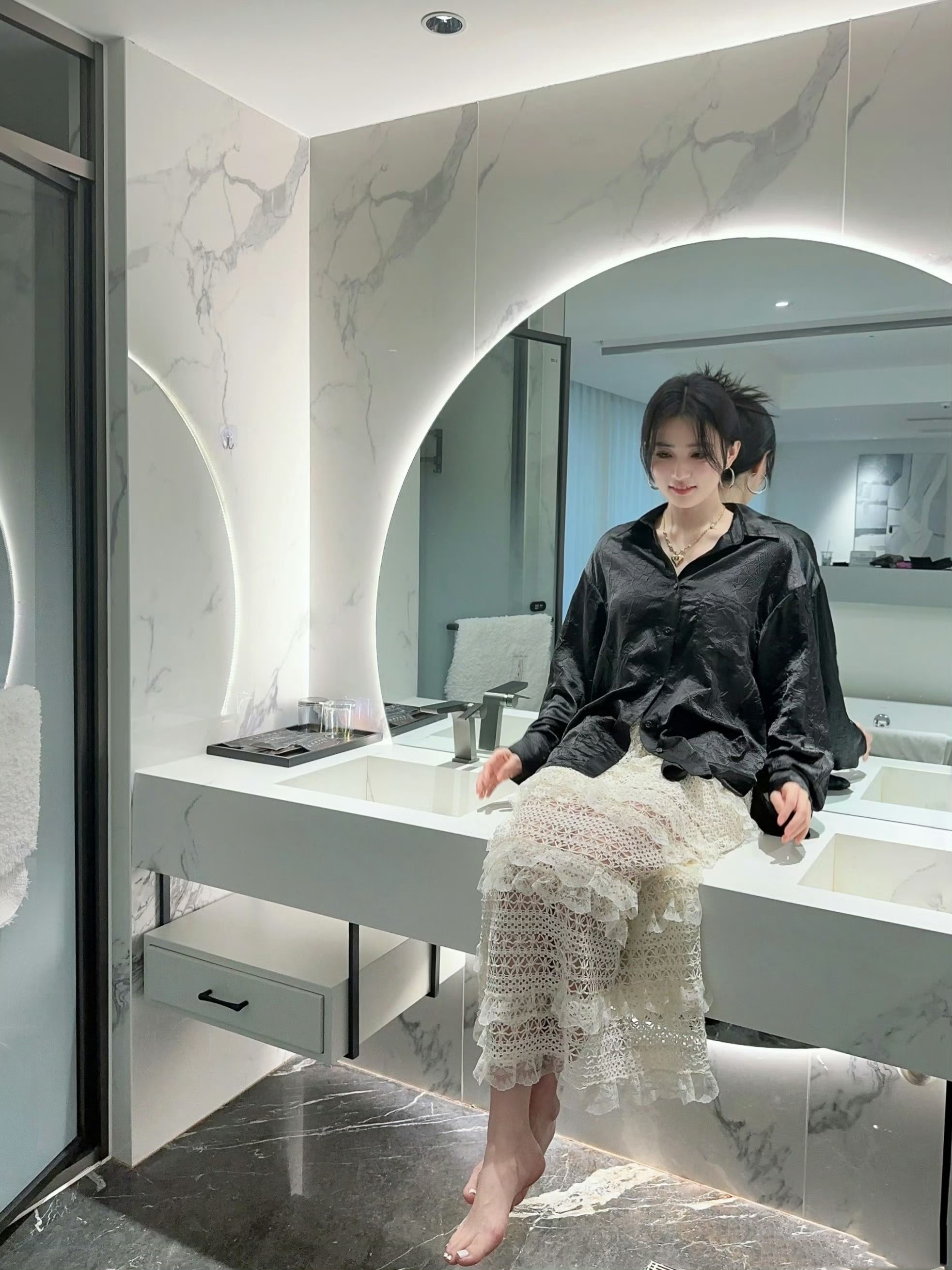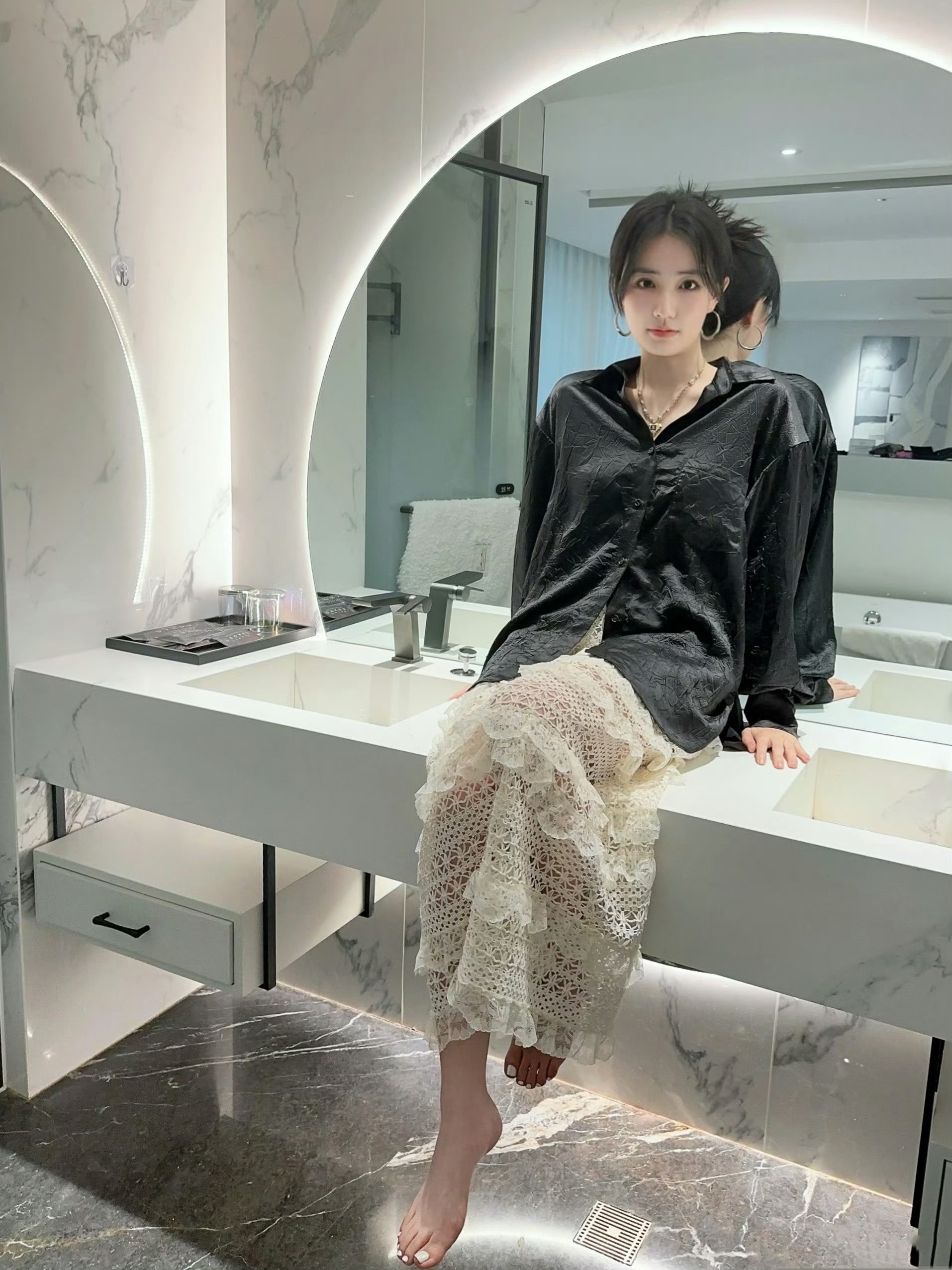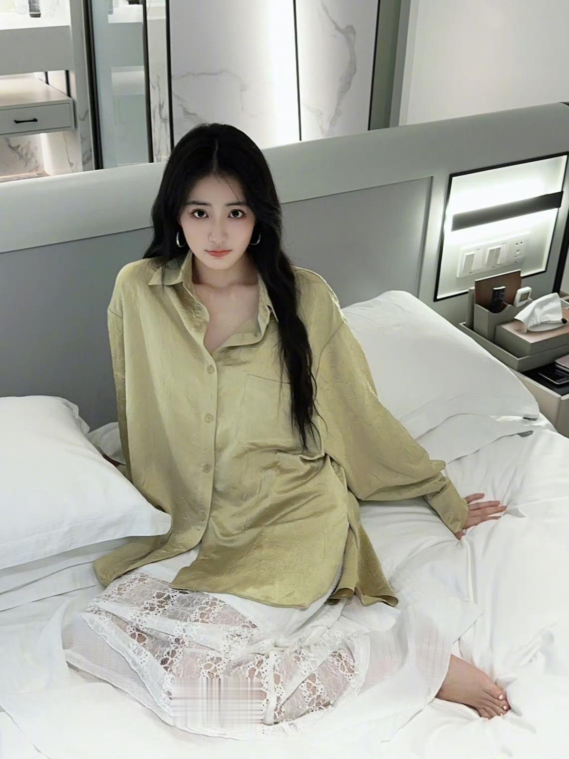 徐璐私服穿搭,缎面衬衣蕾丝白裙,是来自少女的温柔