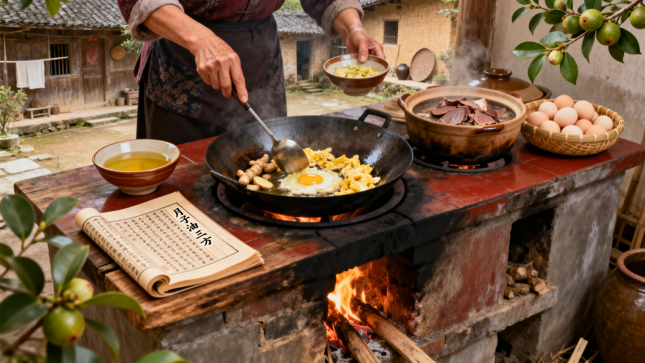 姜茶油煮蛋方——茶油两勺,老姜一片,文火煎香,入蛋炒匀;