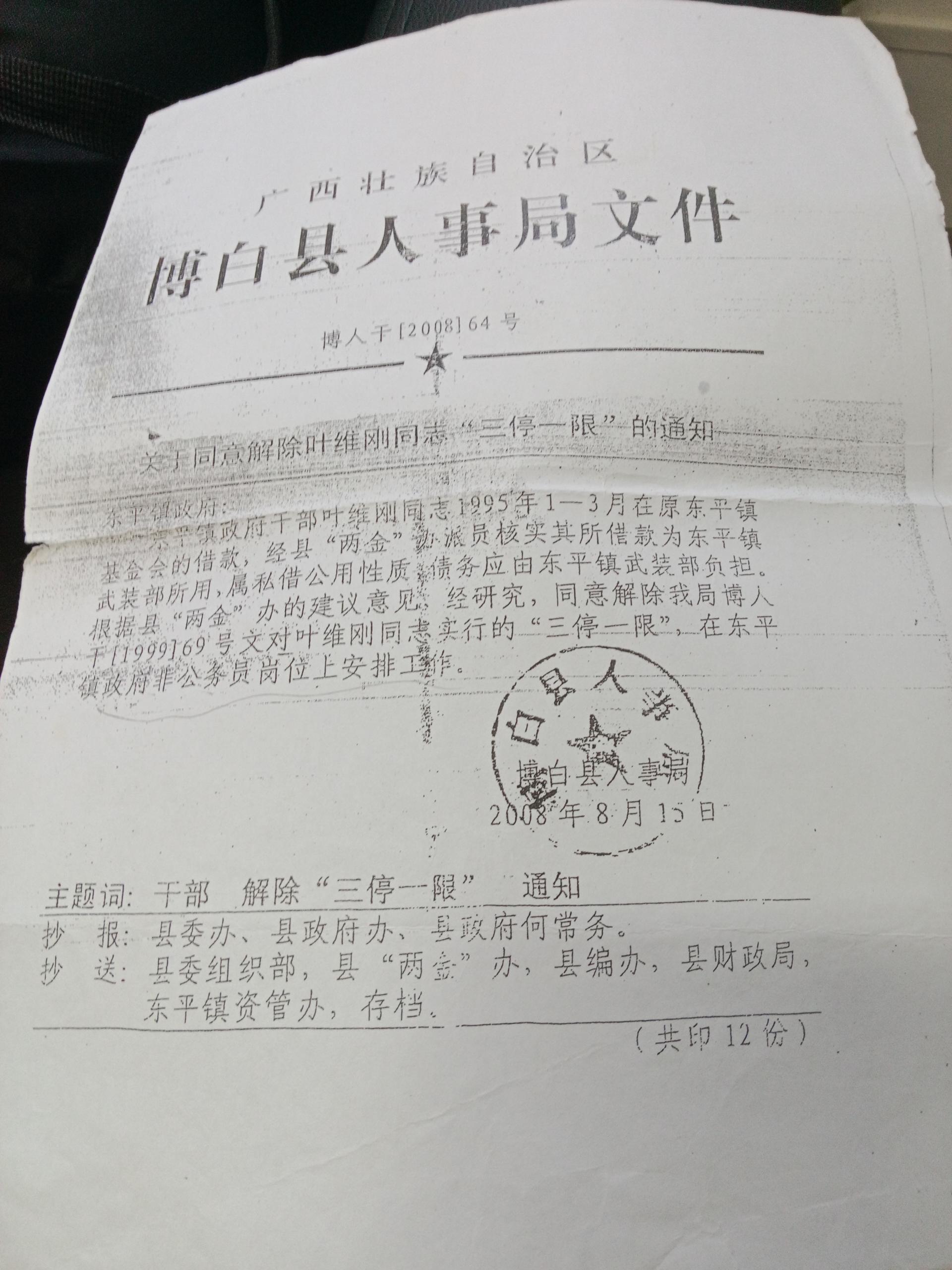 据叶维刚反映,其与爱人自1999年起多次向上级领导反映借款并非个人所用的实情,直至2008年8月,博白县人事局才发布博人干[2008]64号文件,明确经县“两金”办派员核实,叶维刚所借款项为东平镇武装部所用,属“私借公用”性质,债务应由东平镇武装部承担,同意解除对其“三停一限”措施,并要求在东平镇政府公务员岗位上安排工作。
