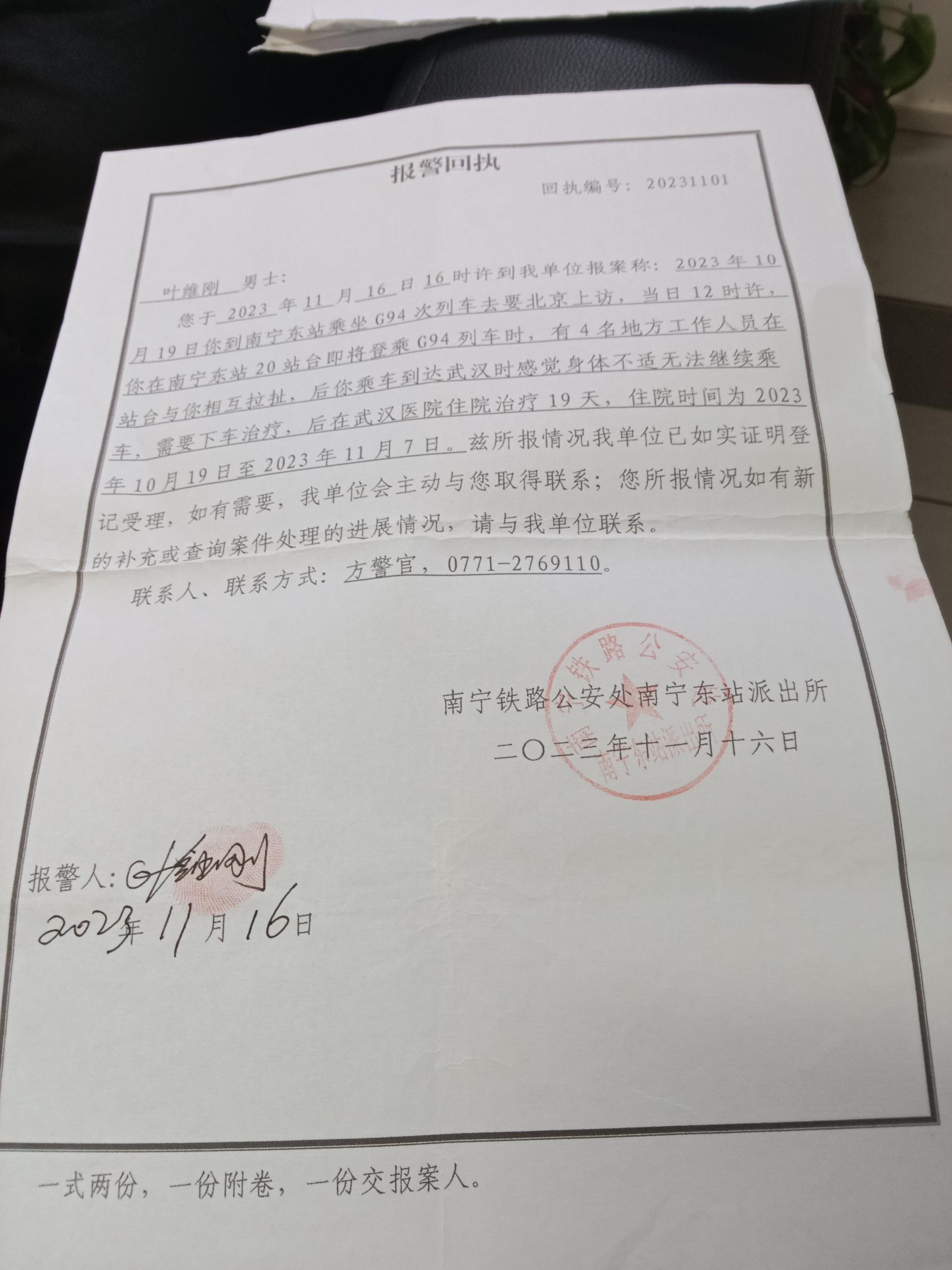 2023年10月19日,叶维刚前往南宁东站乘坐G94次列车赴京上访时,在20站台即将登车之际,遭到4名地方工作人员拉扯。随后,他乘车抵达武汉时因身体不适无法继续行程,被迫下车治疗,在武汉医院住院19天,直至2023年11月7日。同年11月16日,叶维刚向南宁铁路公安处南宁东站派出所报案,警方已如实登记受理相关情况,并出具报警回执及受案回执,明确案件编号为南铁公(东站)受案字【2023】402号,联系人方警官及联系电话0771-2769110,告知其可通过该联系方式查询案件进展。
