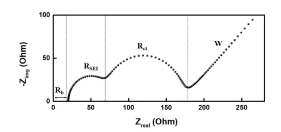 过施加不同频率的交流电,测定阻抗谱(Nyquist图中高频区半圆对应R,半圆直径越小,R越小,电荷转移则越快同时,除高频区RSEI外,低频区W的斜线还可关联离子迁移阻抗,实现对多过程的同步表征。