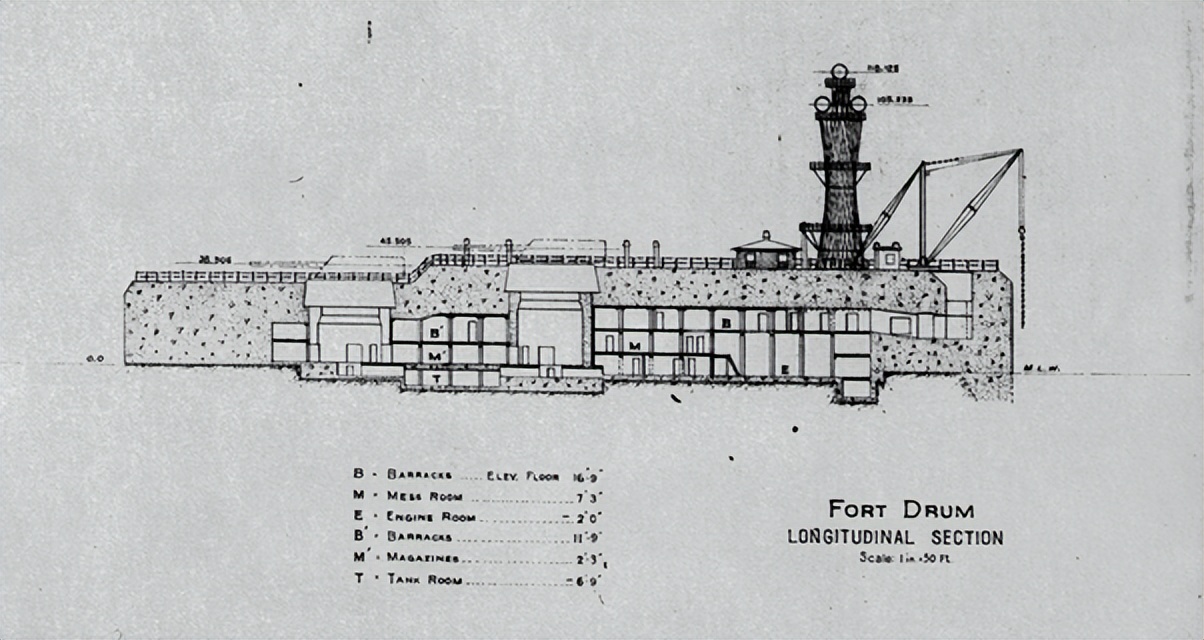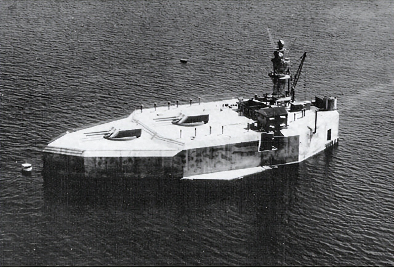 建成后的德拉姆堡,整体呈战舰式流线型,长约107米、宽44米,顶部甲板比低潮位海面高出12米,远远望去就像一艘停泊在海面的战列舰,这是其外号的直观由来。而它的“战舰属性”远不止外形:顶部防护甲板是厚达6米的钢筋混凝土,侧壁厚度更是达到7.6-11米,混凝土层中还夹装装甲钢板,能硬抗当时主流战列舰的大口径主炮直射,防御性能远超不少真实战舰;内部结构也完全按战舰分层设计,底层设燃料库、巨型蓄水库,中层是弹药库、火控指挥中心,上层为官兵兵营、作战操作区,还配备了淡水蒸发器、发电站、制冰厂、通讯站等全套设施,可满足300余名官兵长期驻守,活脱脱一艘“焊死在海上的不沉战列舰”。