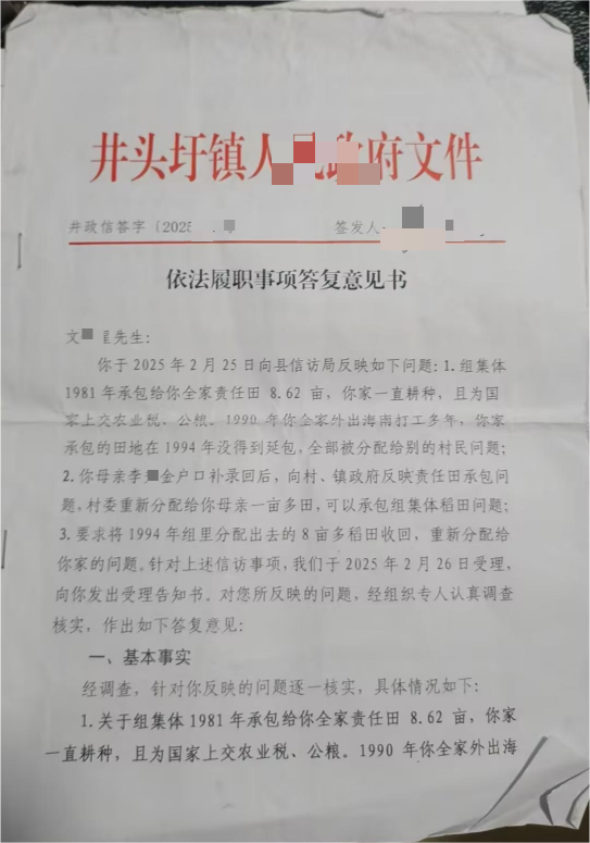 在沟通协调过程中,村集体的答复理由多次变动,时而提及 “户口外迁”,时而重申 “欠缴税费”,但始终未能提供有效的书面佐证材料。2025年相关部门出具的信访答复中,仍以“本轮延包基于1994年承包基础”“无机动地可调整” 为由,未对此前的处理结果作出纠正。此外,整个处理过程中还存在户口补回操作流程不清晰等不规范情况。