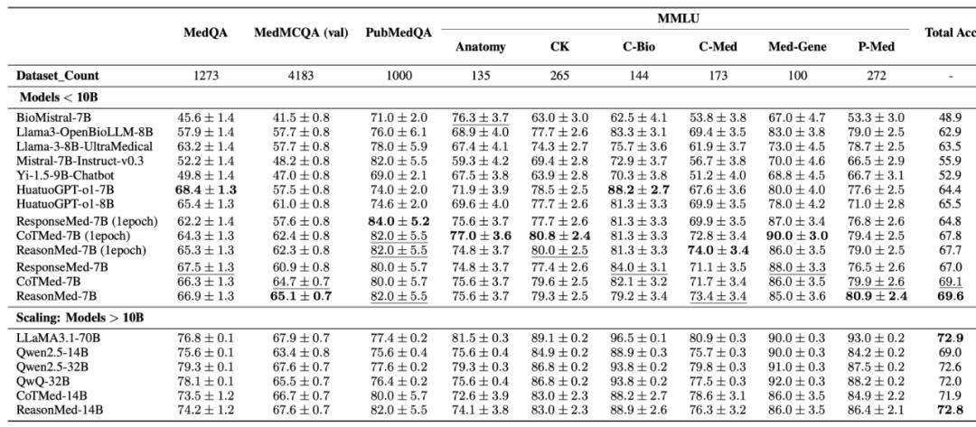 进一步扩展至 14B 参数规模后,ReasonMed-14B 的整体准确率达到 72.8%,相较于 Qwen2.5-14B 提升 3.8%(72.8% vs 69.0%),并在总体性能上超越 Qwen2.5-32B(72.6%),与 LLaMA3.1-70B(72.9%)几乎持平。