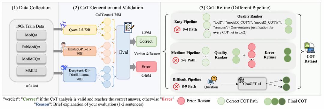 数据匮乏:现有医学领域思维链数据规模较少,且缺乏一个流水线来批量构建一个高质量大规模医学推理数据集;
