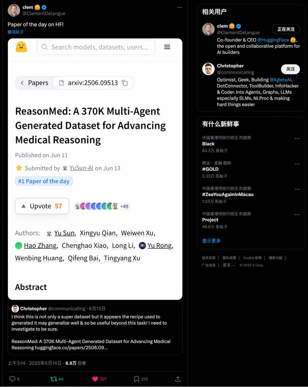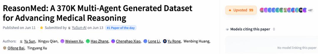 社区反馈ReasonMed 发布后在社区内引发了积极反响。研究者普遍认为其「多智能体 × 分层调优」策略为高质量推理数据生成提供了新范式,并在 Hugging Face 与社区获得了广泛关注。论文发布当天即登上 Hugging Face「Paper of the Day」榜首,并获得 Hugging Face CEO 在 X 平台的转发与推荐,引发了业内研究者与开发者的热烈讨论。
