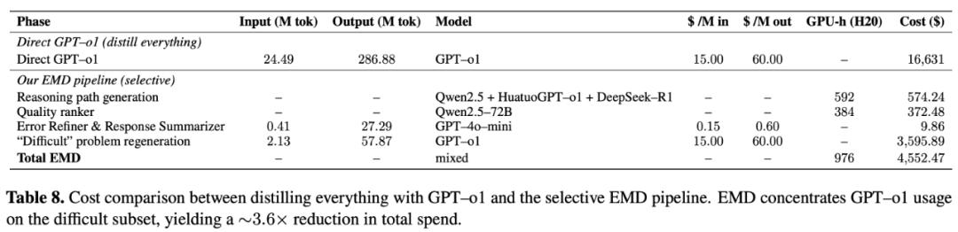 若完全依赖最先进的大模型 API 生成 37 万条复杂推理链,成本预计在 16,631 美元;而在 ReasonMed 的实际设计中,仅约 2.56% 的样本进入最高难度流程,需调用更强模型,其余问题均由中等规模模型完成。 在这一策略下,项目总成本约 4,552 美元(o1 API 推理花费 3,595 美元),实现了 70% 以上的成本节省。