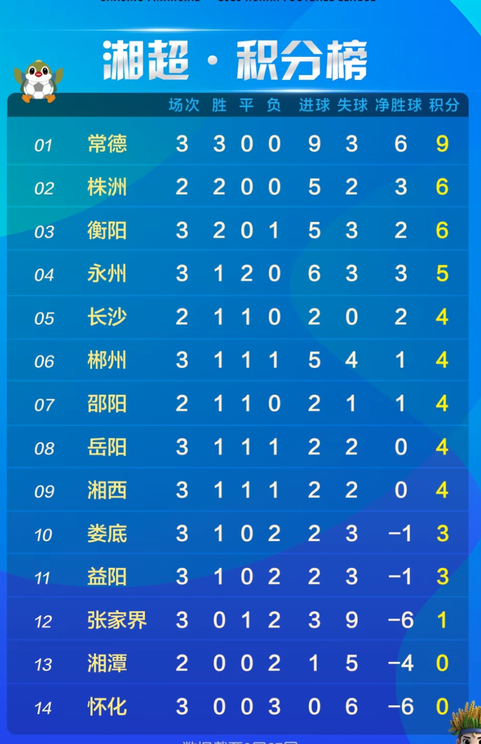 9月27日,湘超进行了第三轮的4场比赛,最新战报如下: