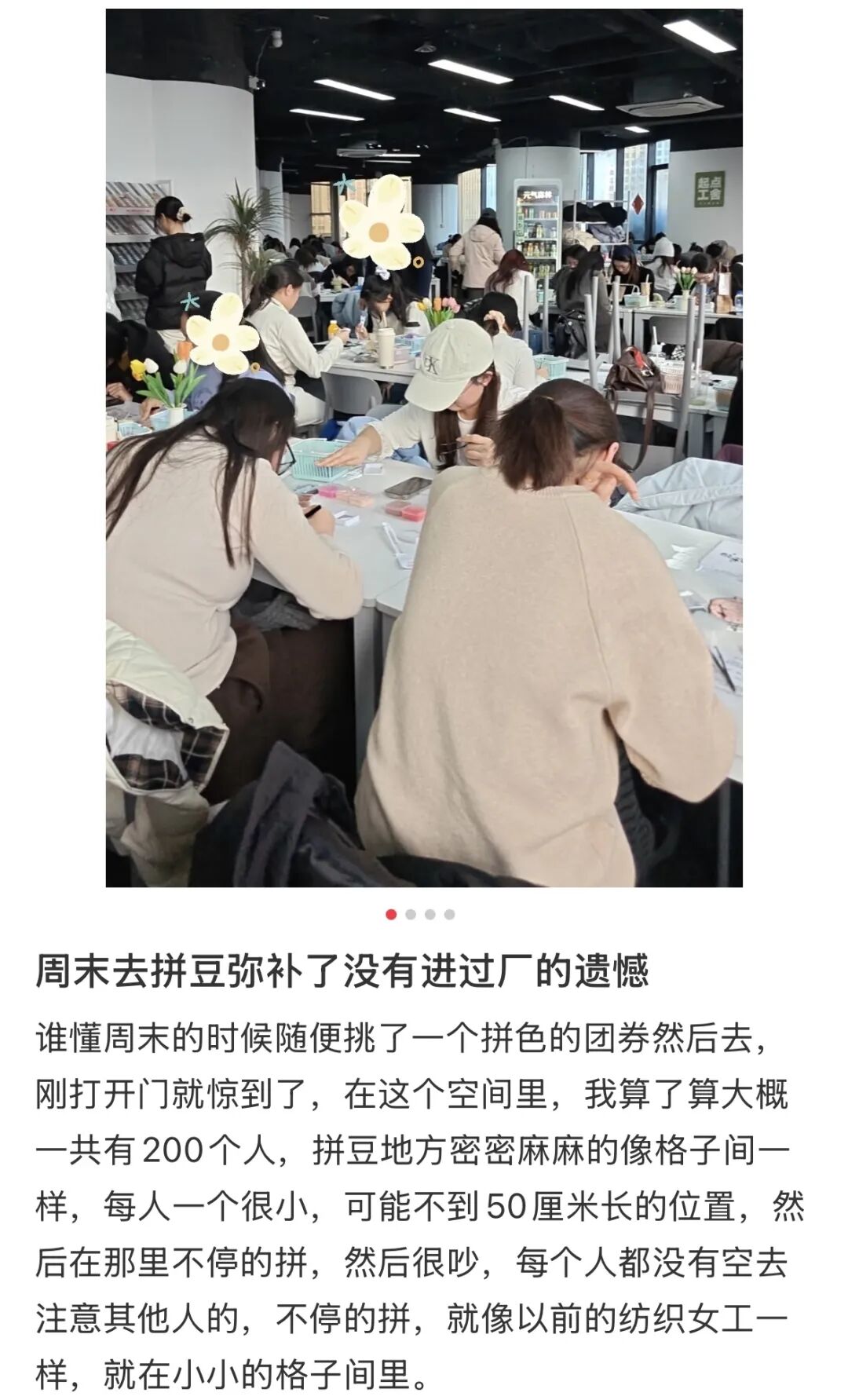 更统一的是人,每人面前一块板子,聚精会神,网上有人把这种场景戏称为 “ 弥补了没进过厂的遗憾 ”。小红书也在 2025 年 12 月发布的《 小红书 2025 年度兴趣报告 》中,将拼豆列为十大出圈兴趣。