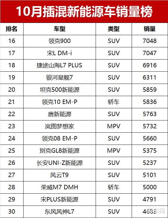排名第二位的是SUV车型是比亚迪方程豹品牌的钛7,10月零售销量达20024辆,是榜单中销量最高的插混SUV。吉利银河A7和海豹05 DM-i分别以15888辆和15661辆的销量位列第三、四位,两款轿车共同撑起插混轿车市场的中坚力量。