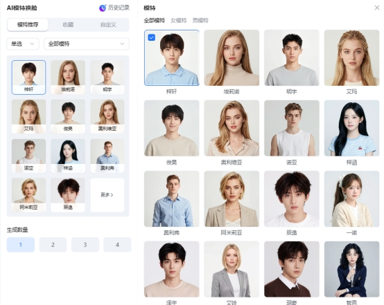 第三步,选择一个模特脸部预设,或者上传新的脸部照片。