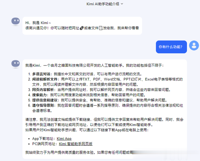 1. 月之暗面-Kimi智能助手一个由月之暗面科技有限公司开发的先进人工智能助手Kimi,其核心能力卓越地体现在与用户的跨语言沟通上,无论是何种语言,Kimi都能轻松应对。