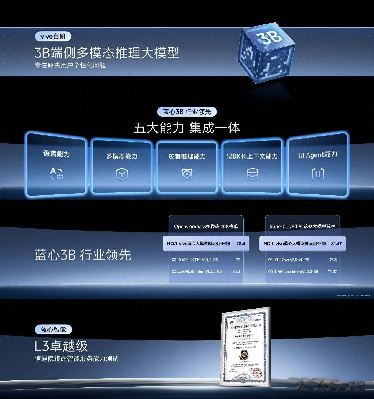 在本次开发者大会上,vivo的AI战略升级清晰地指向了两个紧密关联的核心:全球首个专为端侧Agent构建的3B多模态推理大模型和全新的蓝心个人智能框架(BlueHeart Personal Intelligence Framework)。