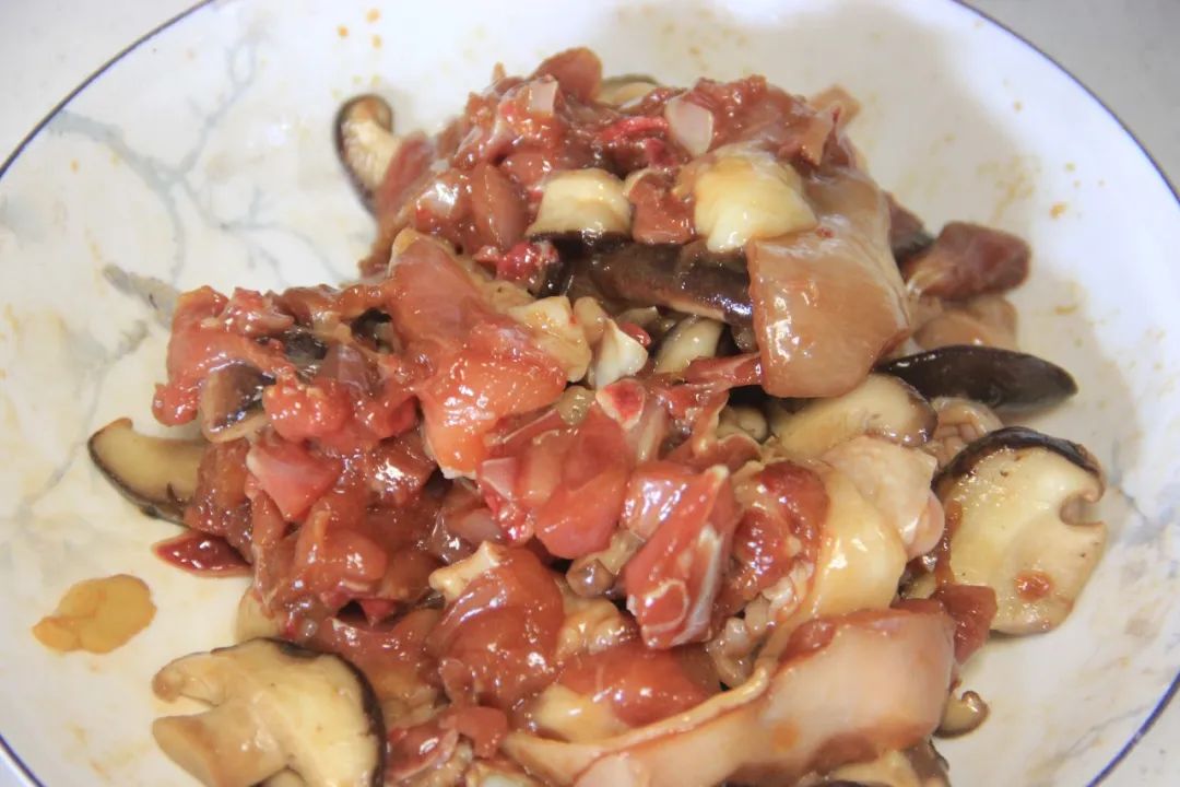 香菇切片,和鸡腿肉放一起,抓匀,腌渍20分钟。