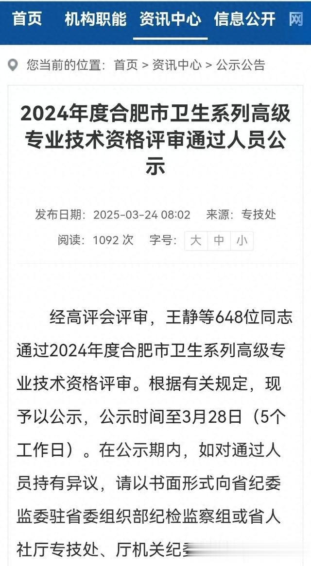 经高评会评审,王静等648位同志通过2024年度合肥市卫生系列高级专业技术资格评审。根据有关规定,现予以公示,公示时间至3月28日(5个工作日)。在公示期内,如对通过人员持有异议,请以书面形式向省纪委监委驻省委组织部纪检监察组或省人社厅专技处、厅机关纪委反映。