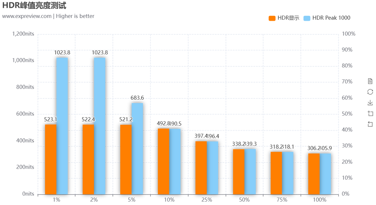 性能实测数据比较扎实。SDR亮度在预设模式100%下跑到288nits。HDR方面,MO32U24提供了HDR Peak 1000和DisplayHDR True Black 500两种路线。切到HDR Peak 1000模式时屏幕会重启一次,这个模式下3%窗口能到1000nits。而HDR显示模式下,10%窗口保持在近500nits,全屏亮度在300nits级别。动态清晰度拿到ClearMR 13000认证,实际跑UFO Test能看到主体和标记点都很清楚,如果还觉得不够,可以开Ultra Clear插黑帧再往上提一档。