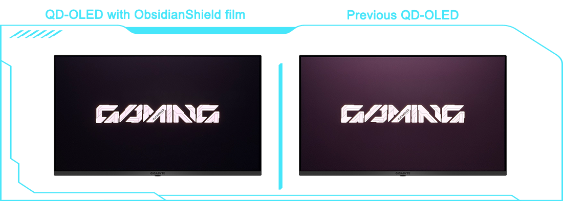 这次技嘉给MO32U24配了新的黑曜保护膜。实际对比下来,两个提升很明显。一是抗反射效果好了一截,息屏或者显示纯黑画面时,屏幕的黑色深度跟边框几乎一致,不会出现那种屏幕比边框浅一点的感觉。二是表面硬度从2H提到了3H,日常擦屏幕的时候更耐划。拿一台技嘉旧款没这个膜的OLED显示器放在旁边比一下,差异一眼就能看出来。