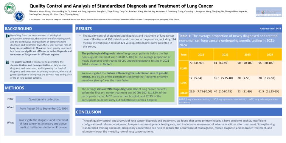 两项成果分别以“双层次肺癌MDT模式作为标准诊疗路径”和“肺癌规范化诊疗质量控制与分析”为主题,系统呈现了河南在肺癌多学科诊疗体系建设与质量控制方面的前沿探索,向100多个国家的专家展示了“如何让肺癌患者少跑腿、治好病”,让中原地区在肺癌防治领域的“诊疗创新”与“质量管控”获得国际学术界认可。