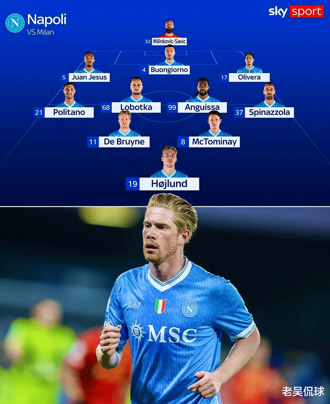 尽管伤兵依旧不少(内雷斯、迪洛伦佐、拉赫马尼、维尔加拉和卢卡库),还是都重要成员,且休战多为20天起步,但孔蒂也有好消息,喀麦隆中场大将安古伊萨也可以首发了。上轮麦克托米奈和德布劳内伤愈回归首发,前者还打入全场唯一进球。今日安古伊萨回归,和洛博特卡组成老搭档。那不勒斯的中前场架构还是很完整了。波利塔诺和埃尔马斯这种在世界杯附加赛消耗身心的国脚,先坐替补席。