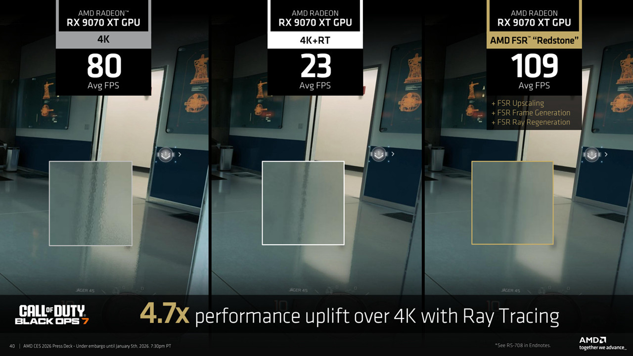 FSR Redstone支持最新的RX 9000系列显卡,在4K分辨率光追游戏实测中,最高能提升4.7倍帧率。