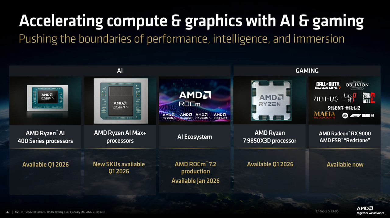 作为目前少数能够同时制造CPU、GPU和NPU的厂家,AMD一直致力于追求给玩家带来极致体验,同时在AI PC领域也逐步发力,占据了自己的一席之地。2026新年伊始,AMD就没闲着,在CES 2026上发布了针对顶级游戏发烧友的Ryzen 7 9850X3D CPU,还发布了代号为“Redstone”的最新FSR技术,推出了移动端新一代Ryzen Al 400系列,该系列搭配了全新的NPU,同时搭配ROCm 7.2版本的优化升级,使得AI性能再上一个新台阶。下面就让三哥带领大家看看这次AMD新品的详情吧。
