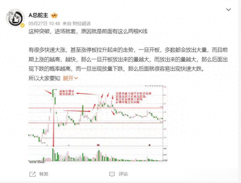 如果第二天直接大幅高开震荡,那么这种走势就属于是风险比较大了,因为在股价走出突破的之后,量越大,那么后面继续上涨的概率是越低,而一旦放大量之后,走出来冲高回落,高开低走的走势,那么一般强则会有一个在这个位置的继续震荡的过程,弱则就会继续下跌。