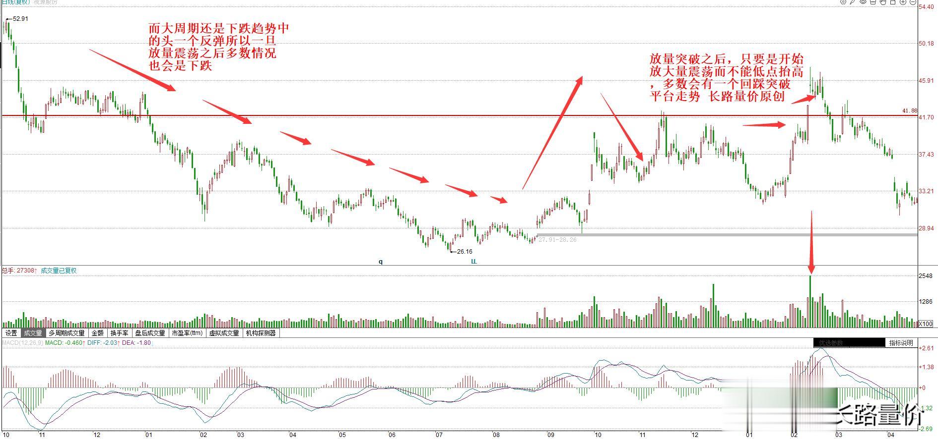 记住上面讲的还只是其一,如果股价大周期还处于下跌趋势中的刚开始出现的震荡,一般大周期下跌之后,股价会有一个反复打上面套牢盘的过程,如果大趋势还是这种大套牢盘的走势,短期还走出来这种突破之后,放大量震荡的走势,那么这种突破后面出现回调的概率是极高的,那么遇到这种突破要注意风险,以上都是本人的浅薄的看法,仅供参考。