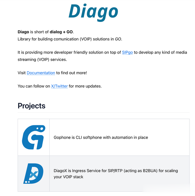 Diago 建立在优化的 SIPgo 库之上,强调项目驱动的 API 设计,确保其功能与真实工作场景紧密相关,特别适合 Go 开发者用于构建企业通信系统、浏览器实时通信应用或其他 VOIP 服务。