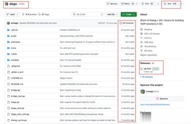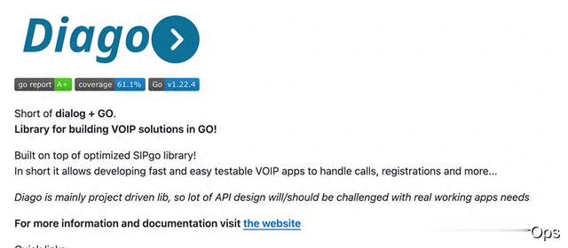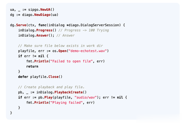 企业内部电话系统或客户支持热线,如基于浏览器的实时通信应用。需要低延迟和高可靠性的 VOIP 服务,如语音会议或紧急呼叫系统。Go 生态系统的开发者,特别是在需要编译为单静态库的场景中,Diago 的即时运行能力尤为突出。开发入门与示例Diago 的文档提供了详细的“入门指南”,包括 echotest(类似 hello world)的示例,帮助开发者快速上手。该示例展示了如何创建简单的 VOIP 服务,回答呼叫并播放音频文件。开发者还可以在存储库中找到更多示例,探索 Diago 的高级功能。入门链接为 Diago 文档,适合初学者快速构建原型。