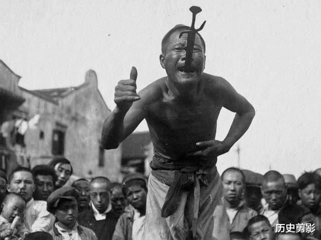还有这种惊险的吞剑表演。艺人用生命换来的掌声,是那个年代底层人讨生活的缩影。