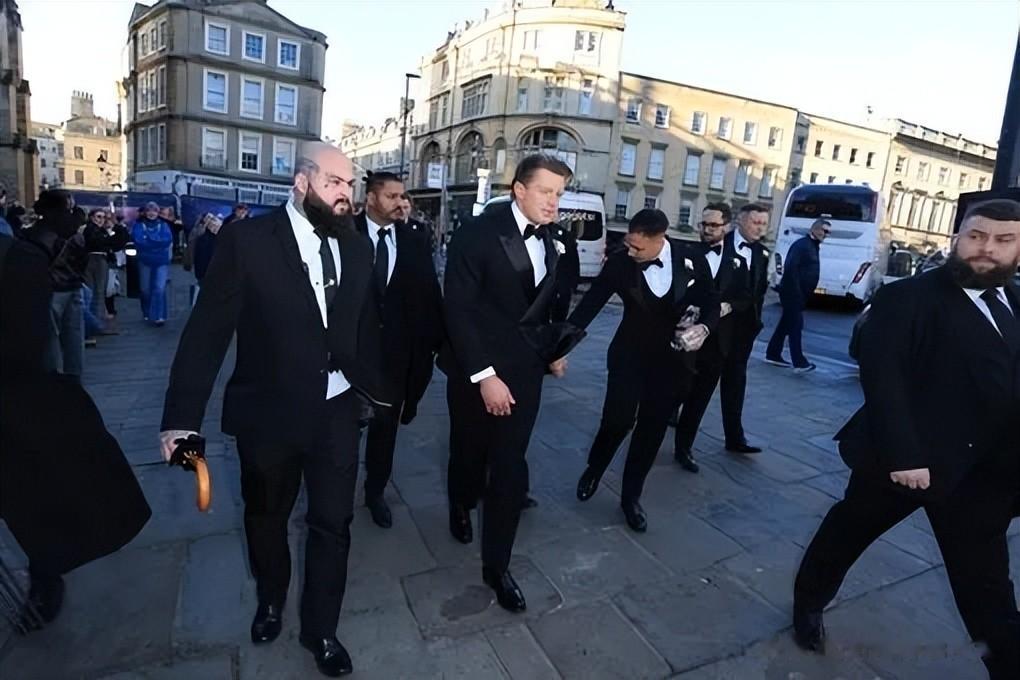 新郎亚当来的时候,也是带了很多伴郎和安保人员,看那场面,知道的是他今天结婚,不知道的还以为他要出门干票大的呢。