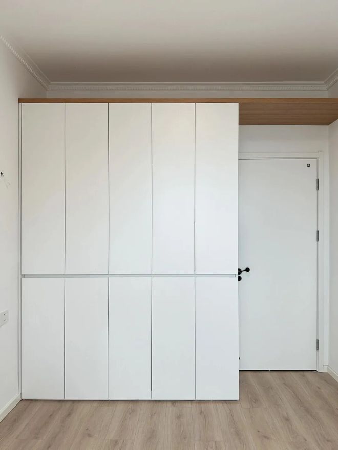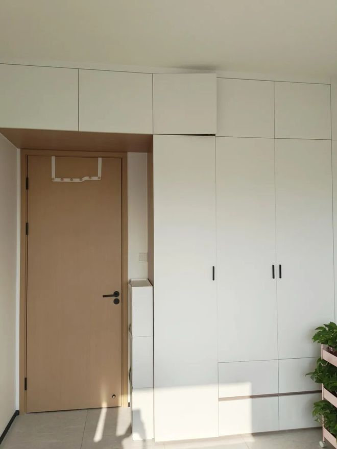 另外,也有一些年轻人会另辟蹊径给衣柜做不通顶处理,然后利用一块木板延伸至门洞上方。