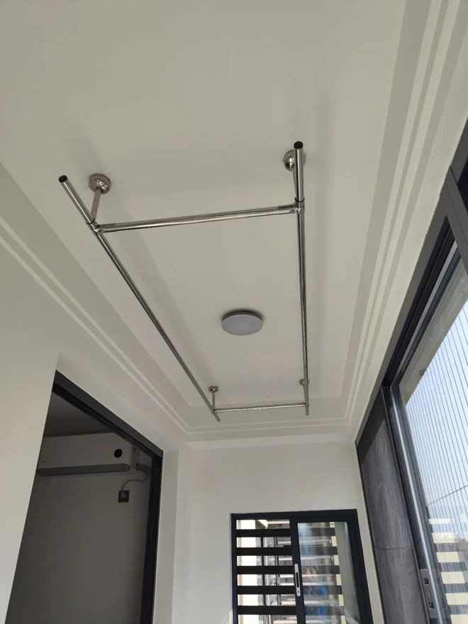 网友@yoyou:考虑了很久,还是决定安装这种固定的不锈钢晾衣杆。为啥不装电动和隐形晾衣杆?主要是怕坏,这个用20年都没问题。