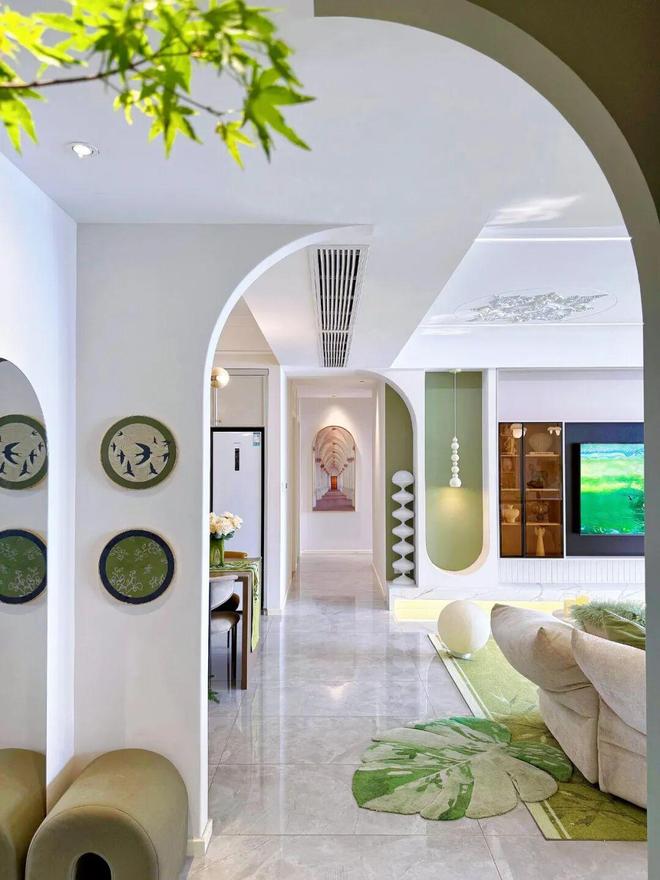 网友@夏花花的家就在进门过道处,以交错的方式做了半弧形设计,不仅视觉上弱化了空间的生硬感,还多了几分松弛与呼吸感。