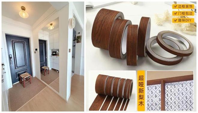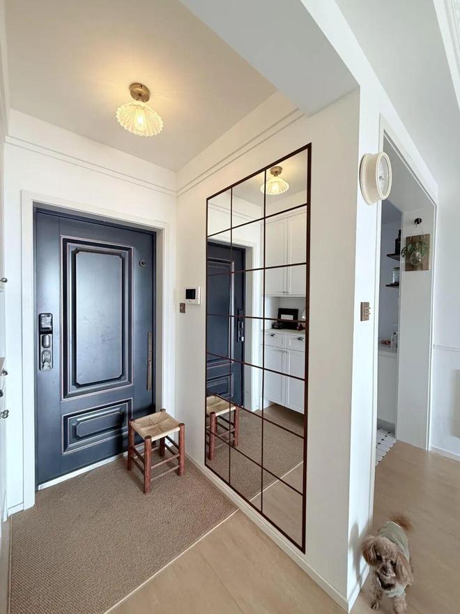像网友@布丁果冻的家,就在玄关处利用方块镜和自粘式木纹包边条,自制了一面复古格子镜。