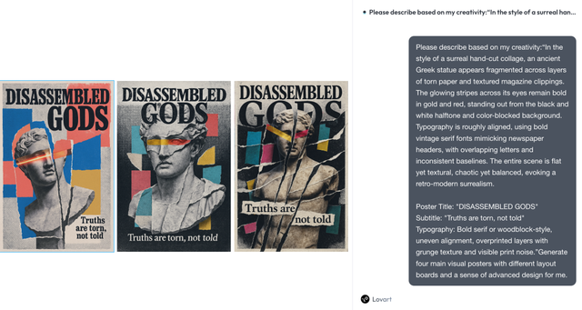 最后,我们必须承认,作为媒体从业者,我们暂时没能与 Lovart 合作出可以媲美官方 demo 艺术水准的作品。