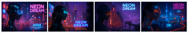 我需要一组「未来都市・赛博幻夜」主题的插画,共 4 张,这四张图像要体现在东京、纽约、重庆、上海四个城市的不同风格。主体视觉是一个戴着发光护目镜的机械少女侧脸,面部有电路板纹理,背景是密集的立体城市与飞行汽车;色调以紫红 / 荧光蓝 / 电子橙为主,搭配黑色剪影与高光点缀;主标题是「NEON DREAM」,采用尖锐的几何字体,边缘有像素化碎裂效果;副标题「2089 虚拟重生计划」以小号字体悬浮于主标题下方,带全息投影质感。