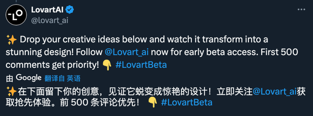 毕竟是「有限测试版访问」,Lovart 的规则是:关注账号并评论,前 500 名留言的读者优先获得内测资格。
