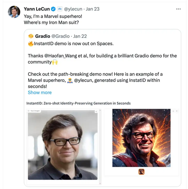 记忆力好的读者可能马上就想起来了,是那个超级火的「AI 写真」项目。火爆到什么程度呢?连 Yann LeCun 都在转发自己的钢铁侠写真: